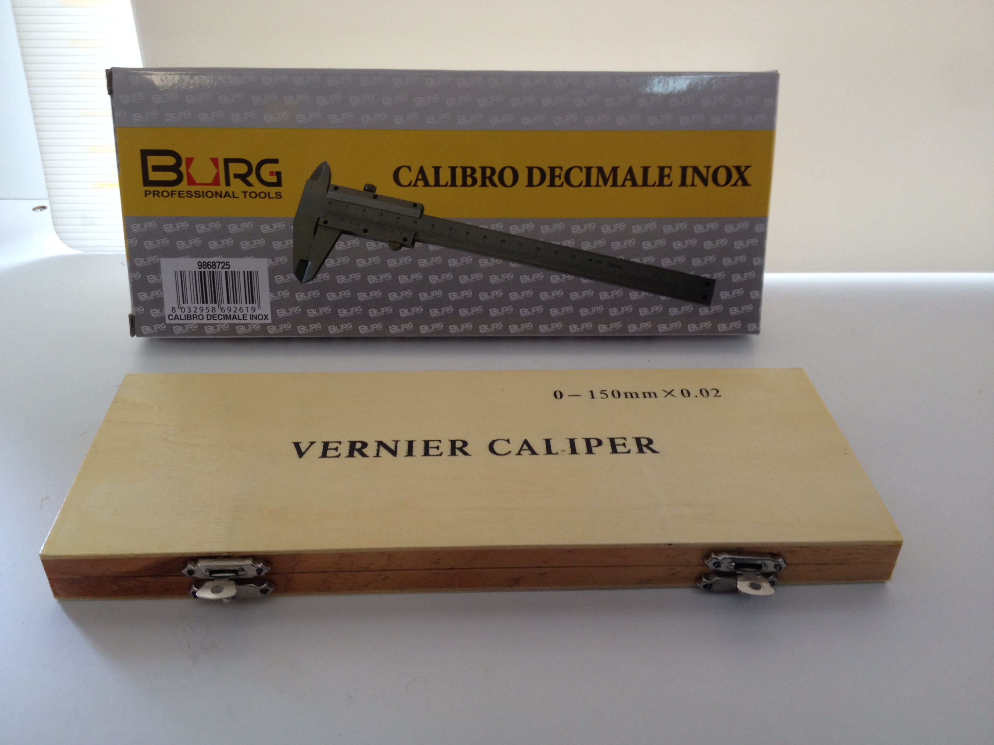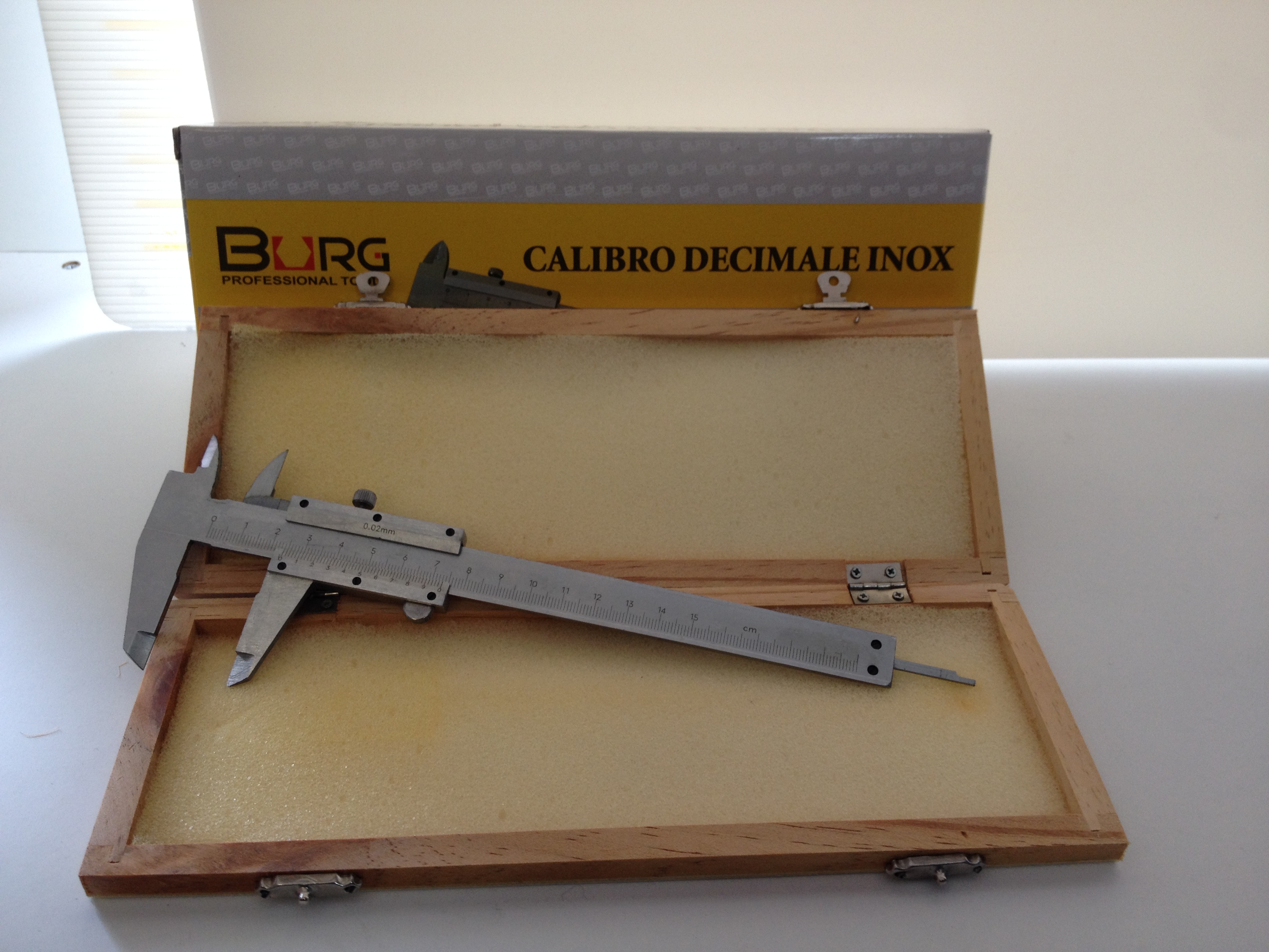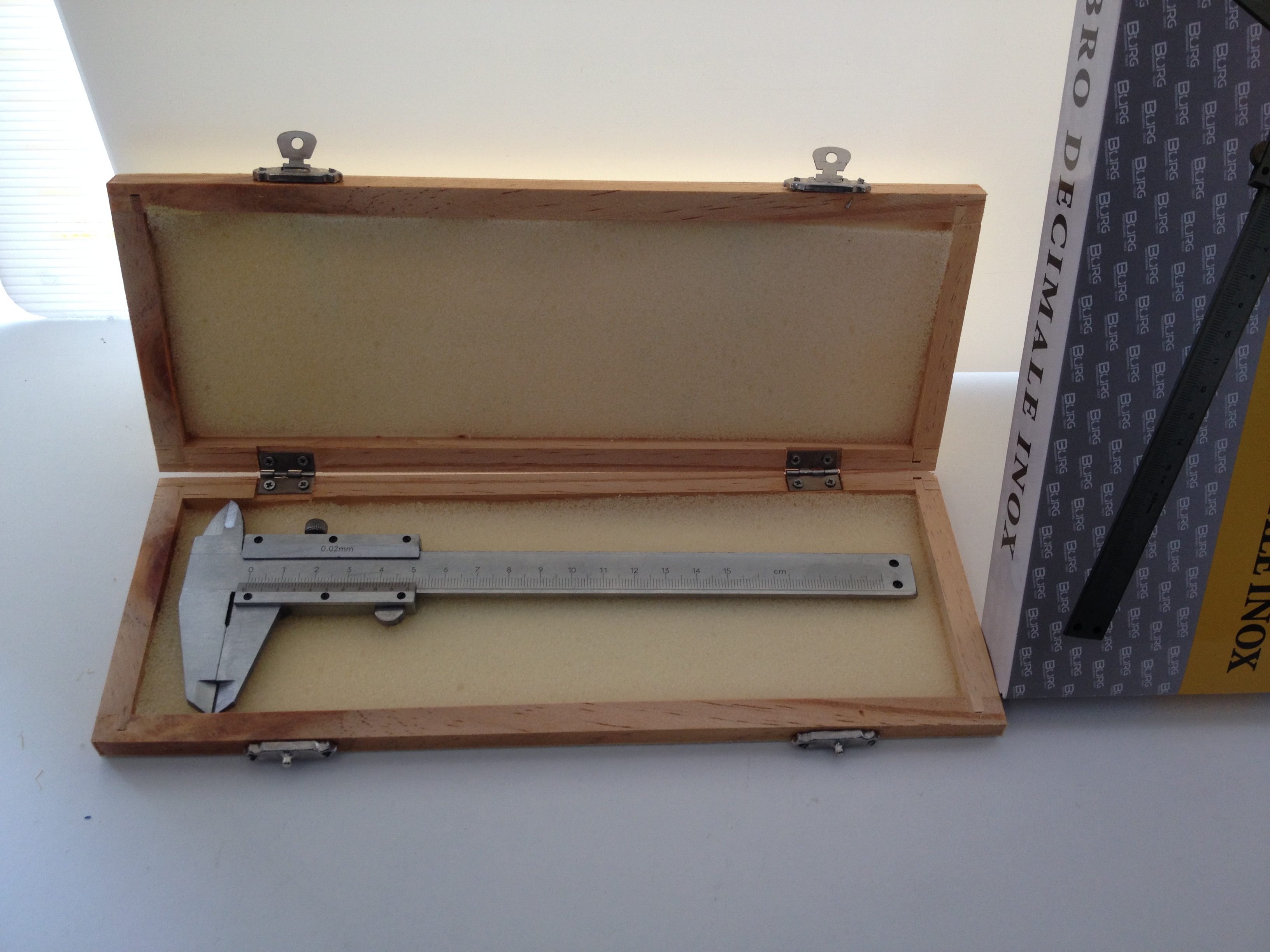 Calibro decimale acciaio inox con custodia cassetta legno.
